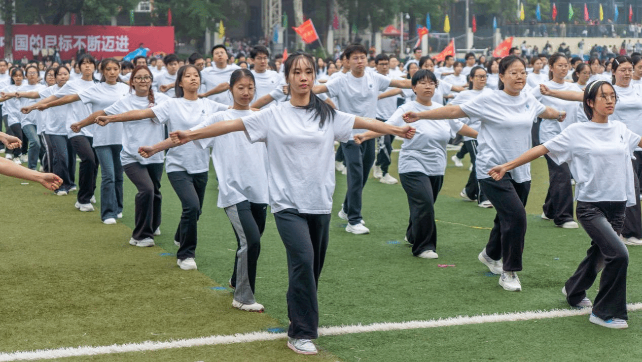 广播体操展示中,教育学院同学动作标准统一,每一个节拍都精准到位,每一次伸展都充满张力,在整体汇演中展现出积极向上的精神风貌。