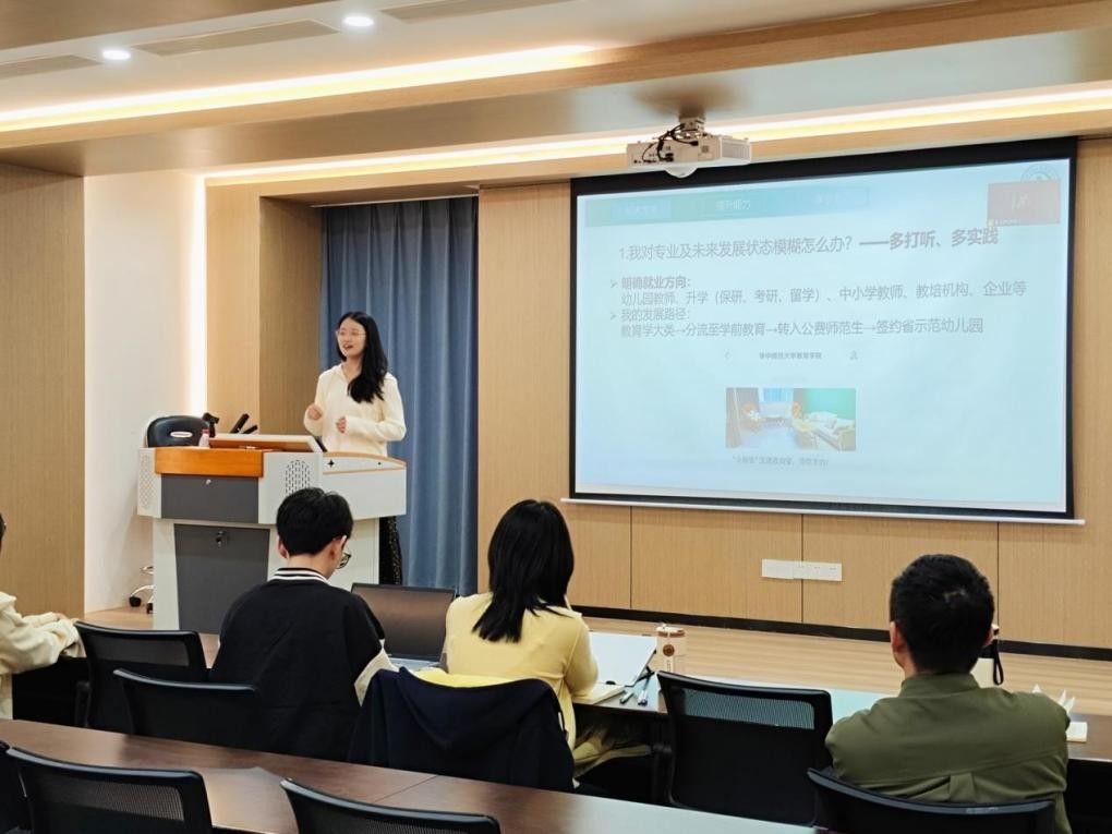 在分享环节,刘茜蓉针对就业与升学的选择、不同园所特点及实习准备进行分析;张佳鑫探讨了毕业去向、地区就业因素及工作心态调整;程婧姗分享了申请香港硕士的条件、多样化实习经历及留学成本与体验;向永佳围绕学业学习、保研流程及职业发展方向提出建议;许倩茹阐述了明确就业目标、面试准备与心态调节的方法;孙佳欣则结合实习实践与科研项目,分享了教育认知与个人成长。学姐学长们一致认为:积极参与实践、提前明确方向并保持主动学习心态,是应对大三阶段挑战的关键。
