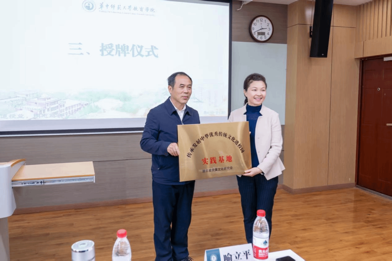 喻立平代表省炎黄文化研究会向我院授予“传承发展中华优秀传统文化进校园实践基地”牌匾,双方将进一步深入合作,以党建为引领,以文化为载体,系统推进经典研读、实践体验与红色教育相融合,引导学生在知行合一中坚定理想信念、厚植文化底蕴、提升综合素养。胡秋春宣读授牌文件。
