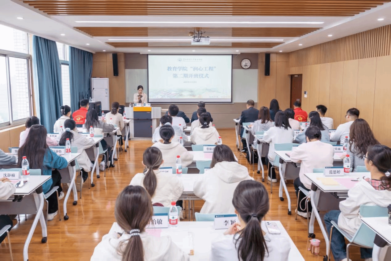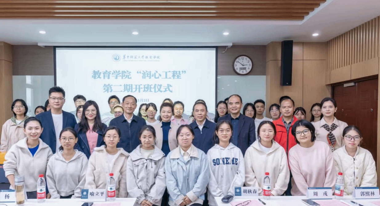 教育学院融媒体中心讯(通讯员 张佩琳 勾良爽 邓渝欣 王美颖)11月2日下午,教育学院“润心工程”第二期开班仪式在田家炳教育书院905室举行。湖北省人大常委、湖北省人大教科文卫委员会副主任、湖北省炎黄文化研究会会长喻立平,湖北省炎黄文化研究会秘书长胡秋春、专家咨询委员会办公室主任杨波,湖北省社会科学院中部发展研究所副所长周戎,湖北省炎帝神农文化基金会副秘书长吕光亮,湖北省炎黄文化研究会文明乡风工作总队队长郭熙林,华中师范大学教育学院党委书记陈雪玲、党委副书记王璐、团委副书记刘雅欣及“润心工程”第二期全体学员参加开班仪式。仪式由王璐主持。