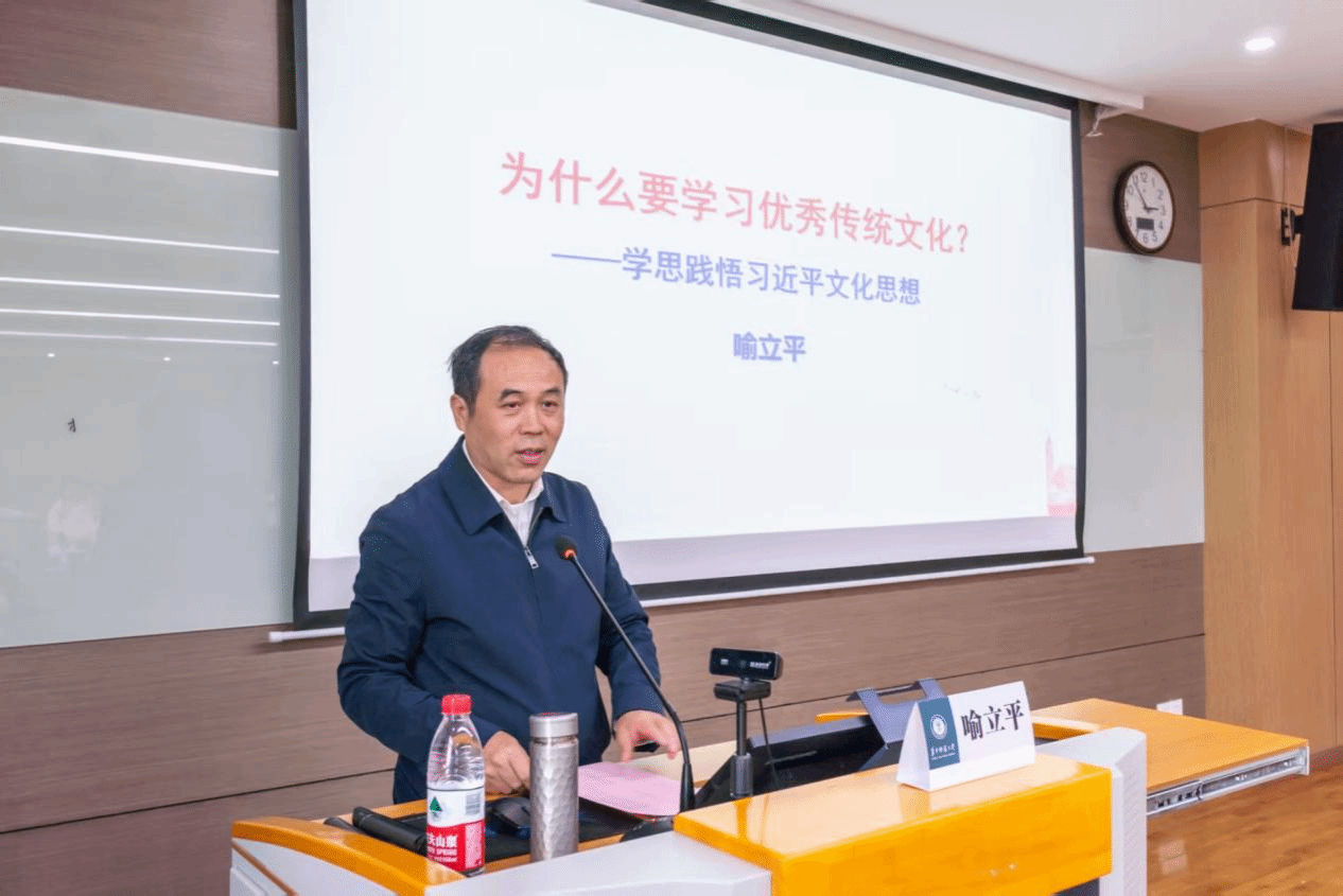 喻立平为全体学员授课。他以“为什么要学习优秀传统文化?”为切入点,引用《道德经》等经典著作中的名言名句,结合中华文化发展历程,深入阐释中华传统文化的内涵与外延,强调优秀传统文化对重要意义和时代价值,引导学员更好地学、思、践、悟习近平文化思想。