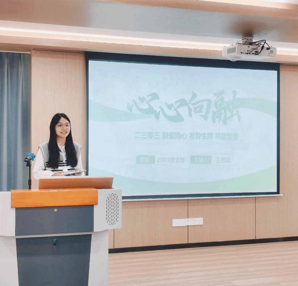 2303团支部代表王思琪以“心心向融:融爱同心 差异生辉 共赴繁星”为主题,分享了支部特色实践经验。她围绕“基石、灵魂、血肉、印记”四个关键词,重点介绍了支部如何结合专业特色,开展特色活动,并探索“团日+科创”模式,依托大创等课题,带动成员参与科研调研。这些创新举措切实提升了团日活动的吸引力和实效性,为各支部提供了可借鉴的实践路径。
