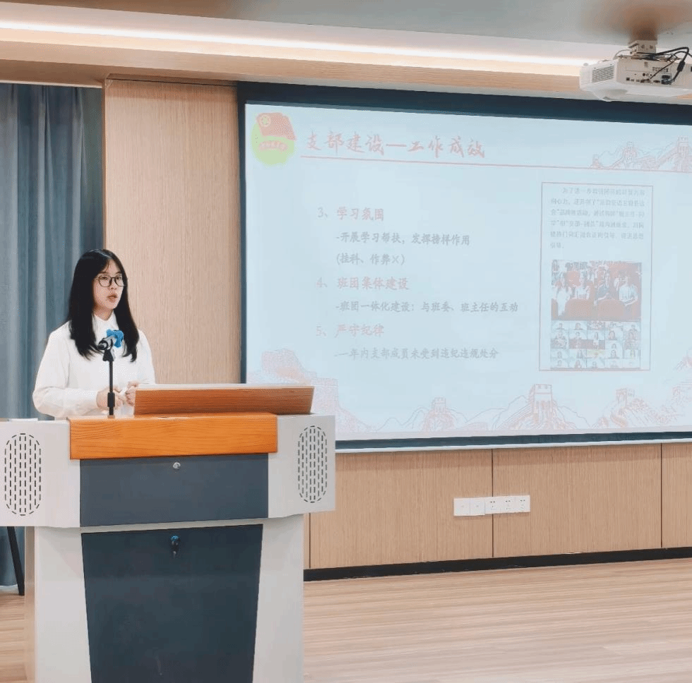 潘怡宁在会上对“三会两制一课”制度进行了详细解读,明确了支部大会、支委会、团小组会的召开频次与规范流程,强调了团员教育评议与年度团籍注册的重要性,并就团课内容设计与组织形式提出具体要求,进一步夯实了团组织生活制度基础。在支部建设培训环节,潘怡宁从组织建设、文化建设、工作成效三个维度展开讲解。