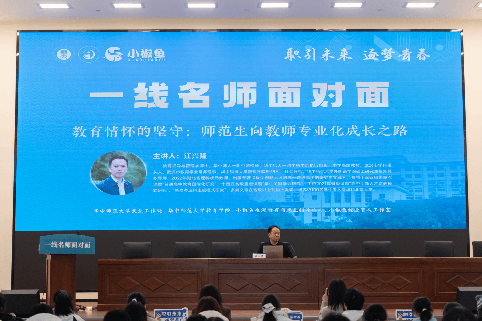 教育学院融媒体中心讯(通讯员 范思婷 罗馥清 黄钰焱 魏银莉)为帮助师范生树立职业理想、明确成长路径,11月26日下午,“职引未来,逐梦青春——一线名师面对面”系列主题活动在华中师范大学新大学生活动中心B栋4楼报告厅举行。本次活动由华中师范大学就业工作处主办,华中师范大学教育学院、小椒鱼生涯教育与就业指导中心、小椒鱼就业育人工作室承办,特邀华中师大一附中副校长江兴隆作主题报告。华中师范大学就业工作处副处长饶艳萍、教育学院党委副书记王璐出席,各年级辅导员代表以及118名本研学生共同参与。本次活动由2024级本科生辅导员彭雨茜主持。