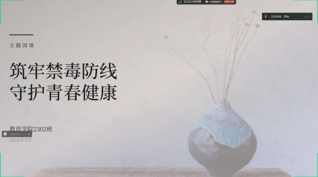 教育学院融媒体中心讯(通讯员 刘馨雨 李淼 朱思雨 余柯屿 李佳凌 魏银莉)为进一步增强青年禁毒意识,筑牢校园禁毒思想防线,以及帮助同学们缓解实习初期焦虑情绪,3月27日,教育学院2302班通过线上会议开展“筑牢禁毒防线,守护青春健康”主题团日活动暨实习交流会。本次活动由2302班班长刘馨雨、团支书李淼、文体委员朱思雨及青协委员余柯屿共同主持,2302班全体同学参与。