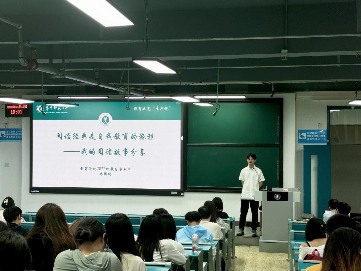 教育学院融媒体中心讯(通讯员 魏银莉)4月19日,教育学院“教育之光青年说”第四期在八号教学楼8310教室举行。本期活动邀请2022级教育学专业本科生高福明担任主讲人,以“阅读经典是自我教育的旅程——我的阅读故事分享”为主题作交流分享。学院百余名本科生到场参与。
