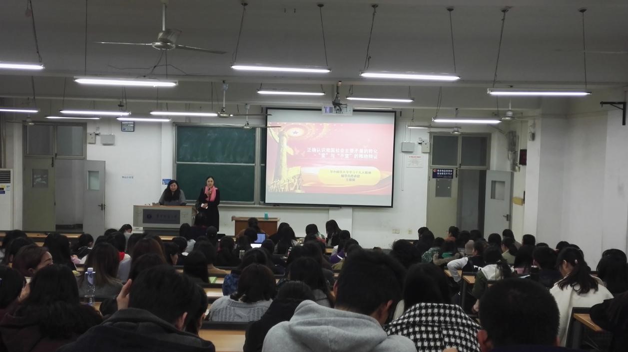 教育学院2015级宣传部讯(通讯员:张子涵 编辑:张萌)11月26日晚8点,“十九大精神辅导员巡讲团”成员、教育学院团委书记王倩倩在8号楼310教室开展题为“正确认识我国社会主要矛盾的转化——‘变’与‘不变’的唯物辩证 ”的十九大精神宣讲。本次宣讲由教育学院2015级辅导员王诗薇主持、2015级全体学生参加。