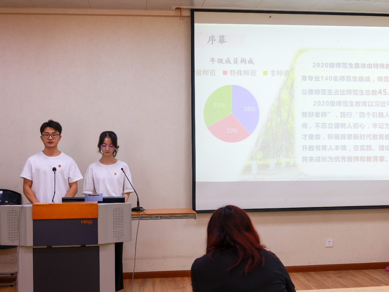 本次评选共设现场答辩和才艺展示两个环节。在现场答辩环节中,前2020级年级主席万义辉、团支书肖函妤表年级进行答辩。他们围绕落实实效要求、打造专业特色、开展党史学习、践行知行合一四个维度对过去一年里师范生集体的日常工作、特色活动做了介绍,具体形象地展现了2020级本科生奋发进取的风采和立德树人的情怀。在答辩结束后,王倩倩针对PPT设计的美观性、讲稿内容的适切性及思路的逻辑性提出改进建议。
