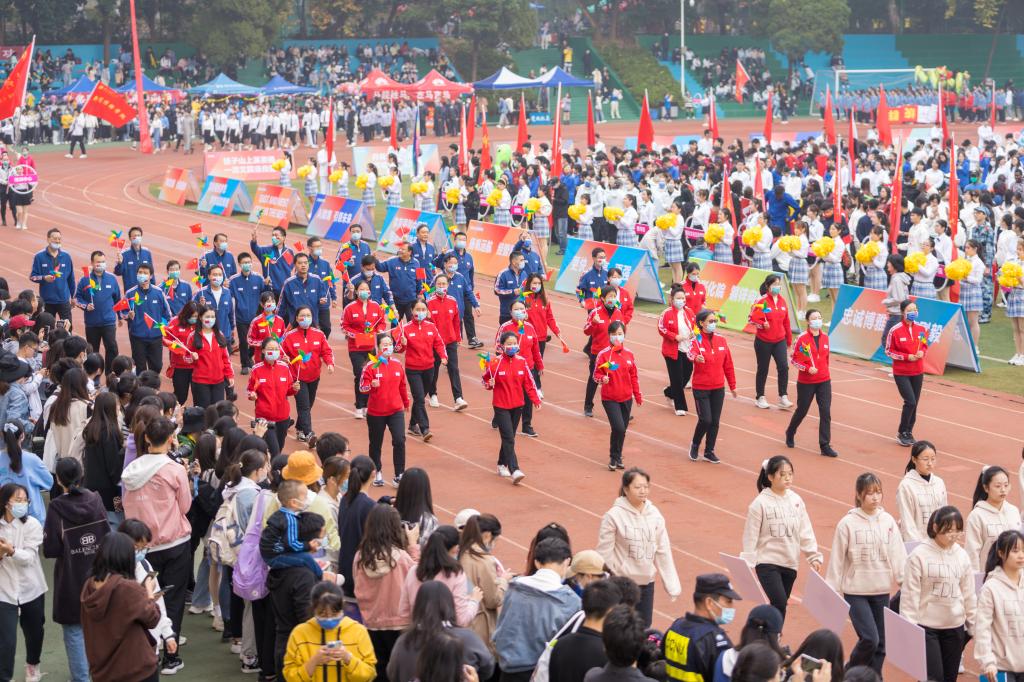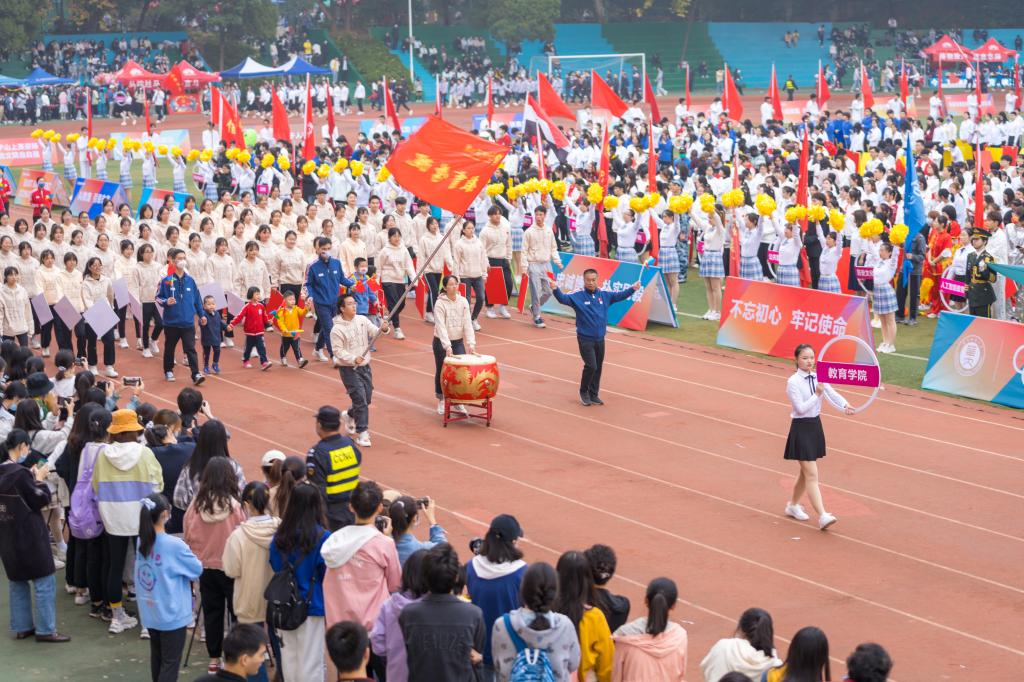 华大青年讯(通讯员 陈祯盈 赵恒健)11月5日上午,华中师范大学2021年校运动会开幕式在佑铭体育场举行。本次开幕式共有40个学校单位参与入场式队列行进,教育学院方阵位于第36个出场。