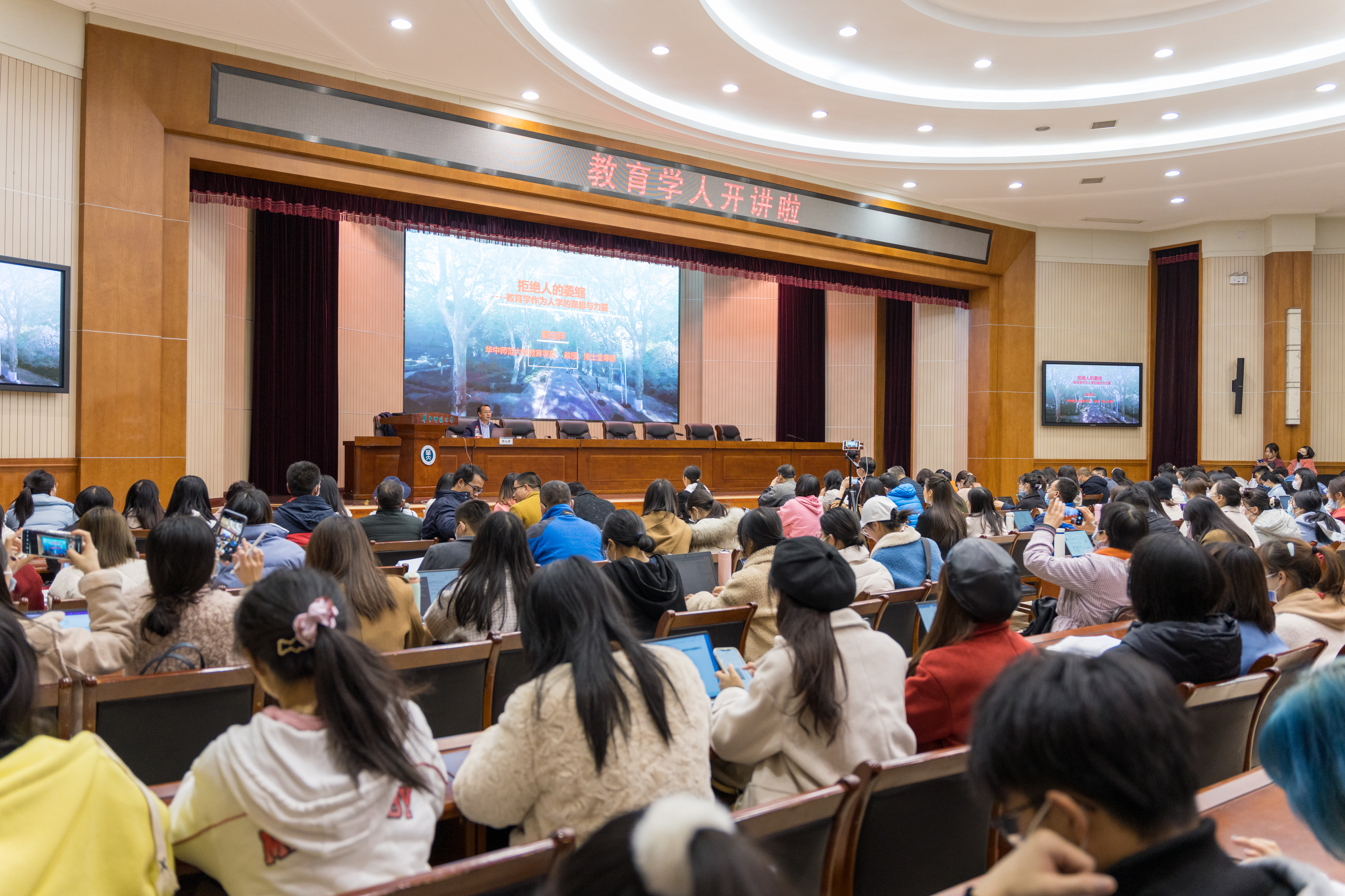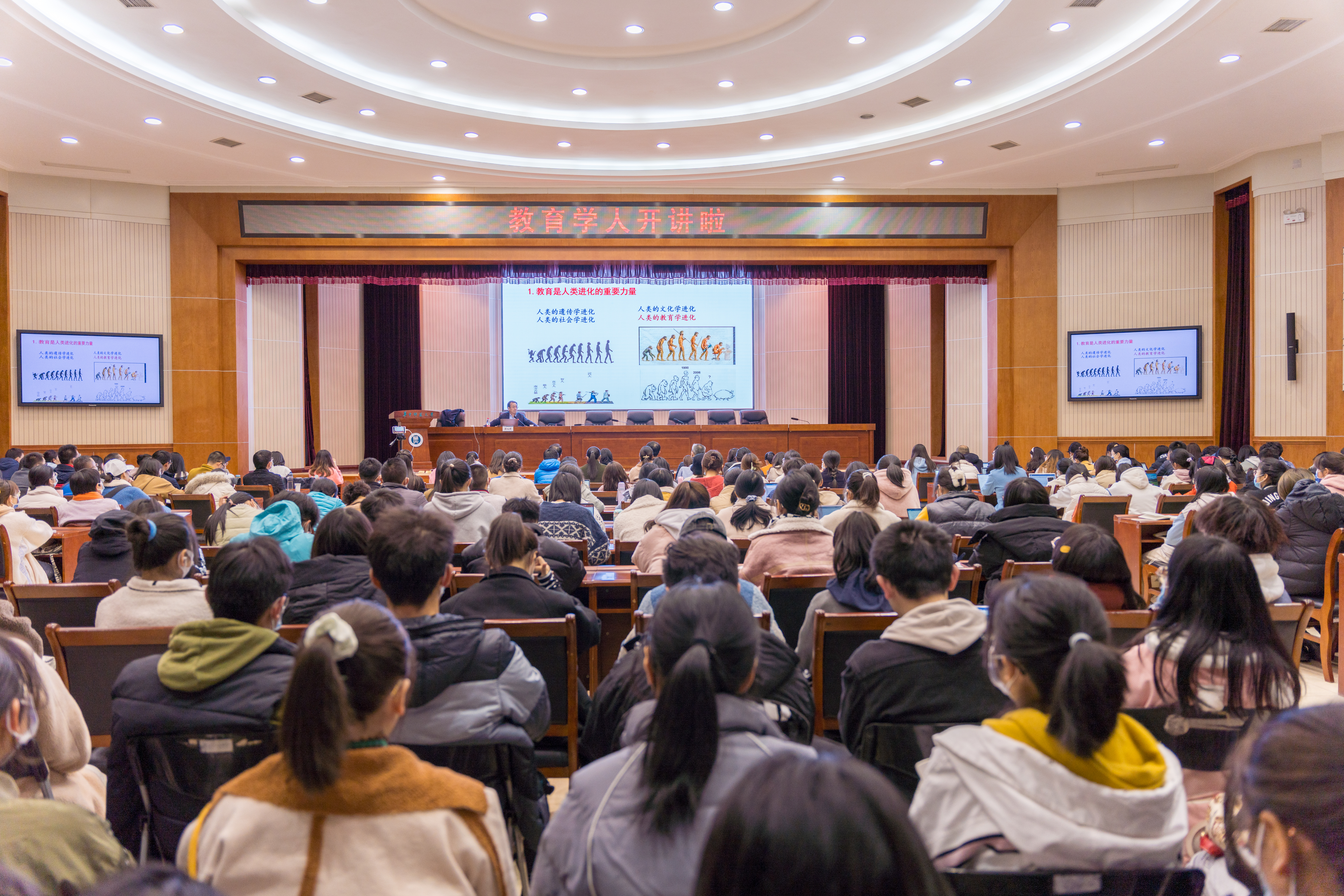 教育学院融媒体中心讯(通讯员 王秋妮 刘怡然)11月24日晚,教育学院“教育学人开讲啦”第二讲在科学会堂一楼报告厅举行,教育学院二级教授、博士生导师郭元祥做了《拒绝人的“萎缩”:教育学作为人学的理想与力量》为主题的学术报告。教育学院党委副书记黄玉新、教育学院本科生和研究生辅导员、部分教师代表、2021级本科生、研究生,以及院内校内外有关专业研究生400多人参加了学术报告会。郭教授的学术报告视野开阔、观点新颖、语言幽默、思想深刻,引人深思。