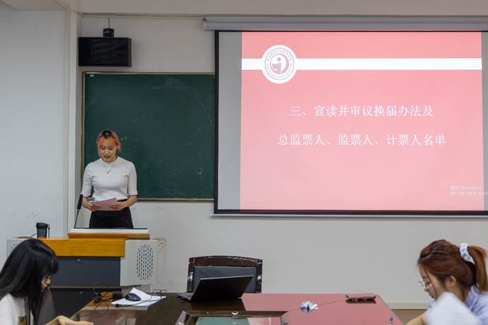 教育学院融媒体中心讯(通讯员 赵恒健 胡杨平)7月3日,华中师范大学教育学院第十六届学生代表大会在田家炳教育大楼513B室及腾讯会议召开。教育学院党务干事王诗薇、团委书记王倩倩出席会议。教育学院第十六届学生代表大会主席团、秘书长、总监票人、监票人、计票人、第十六届团委学生会主席团及团委副书记候选人线下参加本次会议,全体学生代表线上参加本次会议。教育学院第十五届团委学生会办公室主任程婉津担任大会主持人。