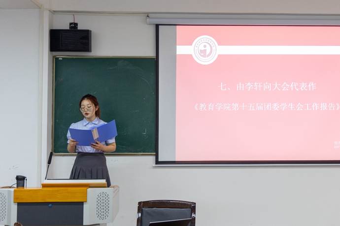 会上,我院第十五届团委学生会主席李轩作《华中师范大学教育学院第十五届团委学生会工作报告》,向大会汇报了我院第十五届团委学生会的年度工作成效,展望我院第十六届团委学生会未来路向。报告以“砥砺奋进,共克时艰”为主题,从加强内部组织建设、加强思想政治引领、打造社团品牌特色、注重文艺体育活动、坚持日常维权服务等维度展现了上一年度重点工作及创新特色,并对下一年度团学工作提出期望。