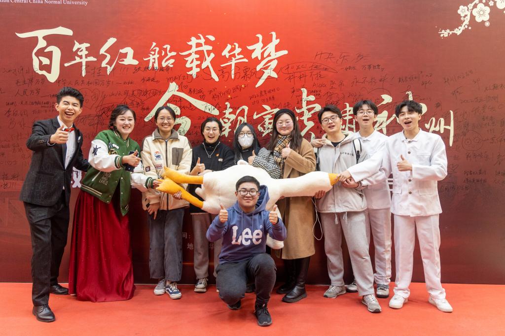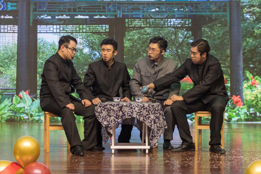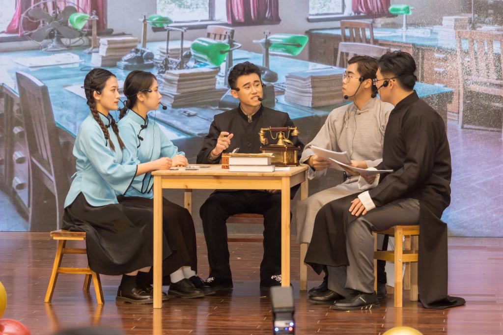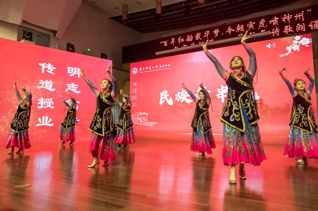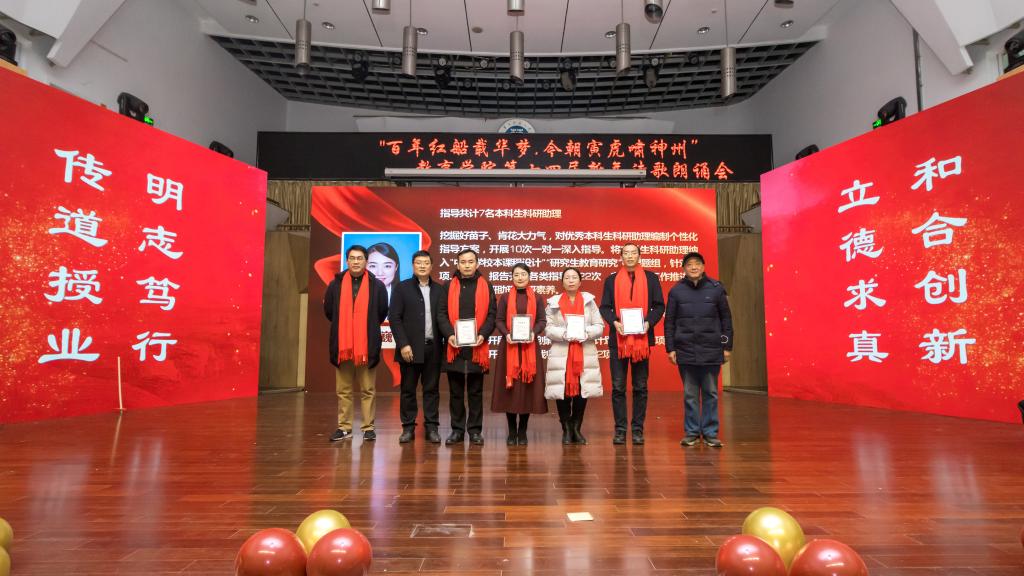 教师是新时代的火炬,点燃教育火种,传递未来希望。在本场晚会中,张扬和黄玉新分别宣读优秀本科生导师和优秀班主任名单,勉励投身教育事业、专注教书育人的十四名优秀教师,李玲、董泽芳、陈佑清等分别为获奖教师颁奖。晚会进入下半场,研究生会编排的话剧《王亚南——资本论传奇》开演,用生动的表演演绎出华师人王亚南对爱国情怀的坚守与对救国使命的担当。伴着《我和我的祖国》的音乐响起,会场气氛再度进入高潮,全场观众与全体演职人员齐声高歌,表达对伟大祖国的热爱和祝福。