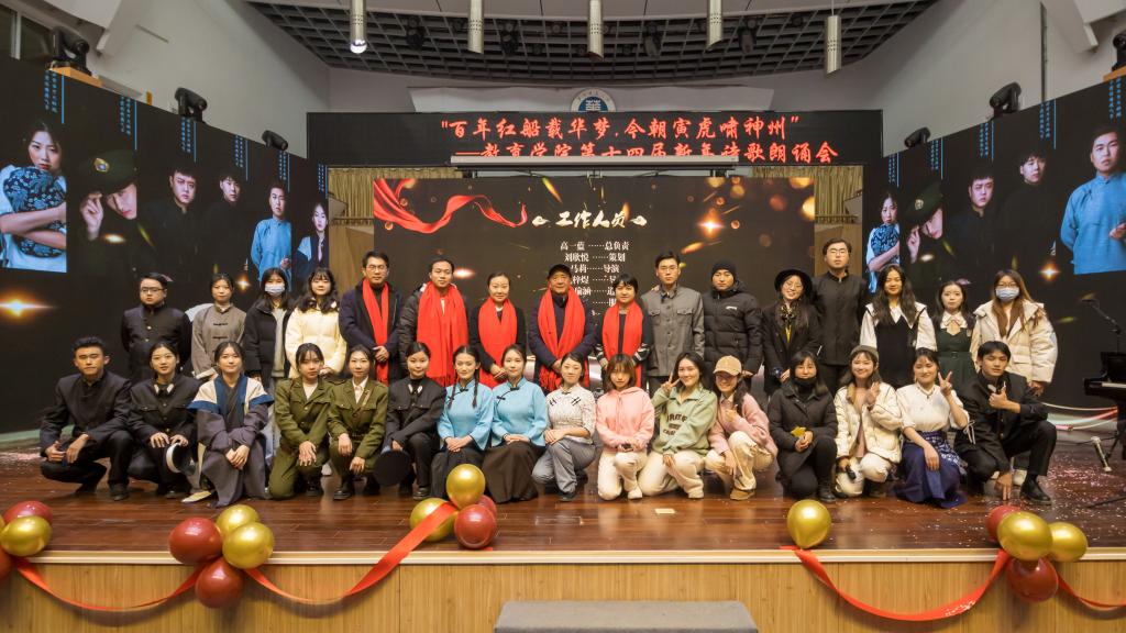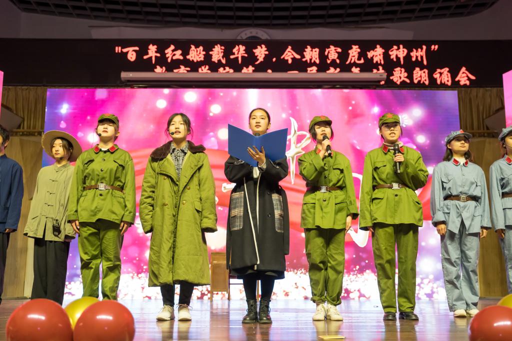 本届新诗歌朗诵会正值建党百年的时代契机,以“百年红船载华梦,今朝寅虎啸神州”为主题,分为“星火·风雨兼程”、“激流·长风破浪”、“新禧·同心筑梦”三个篇章,由学院师生共同演绎,融合初心使命、革命精神、人民情怀等元素,包含歌舞、朗诵、话剧等多种形式。
