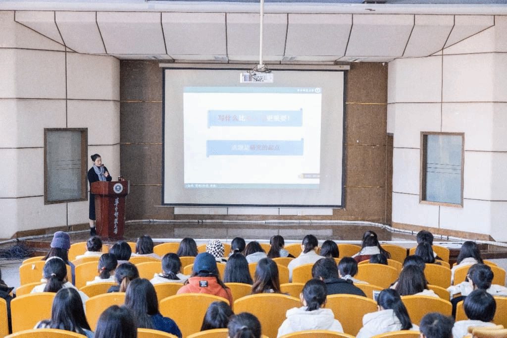 首先,叶庆娜从“选题”一词的词性进行分析,让同学们理解科研选题的含义和重要性。她表示,只有确定了研究的主题,才能确定科研的方向、内容和方法。随后,她建议同学们在教育改革与发展遇到的新情况、教育现象的观察、信息交流与探讨、各种文献资料中多多留心,学会挖掘合适的课题。在讲解选题来源时,叶庆娜运用了生动形象的比喻,将热门选题、导师指定的选题、自选课题这三种选题方式分别比作“大众情人”、“包办婚姻”、“自由恋爱”,并依次对这三种选题来源做出说明。她强调,在选择课题时要考虑其研究意义、资料支持、创新亮点,确保研究开展的可能性,不能一味追求热门和新意。