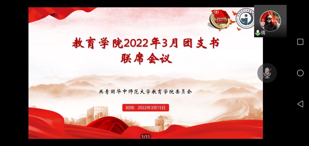 教育学院融媒体中心讯 (通讯员 吕培瑶)3月15日,教育学院三月份团支书联席会议在线上举行。教育学院团委书记王倩倩、2021级本科生辅导员刘雅欣、研究生辅导员许家瑞出席本次会议,团委组织部成员、本科生及研究生各年级团总支,各支部团支书线上参会。会议由组织部负责人杨鑫林主持。