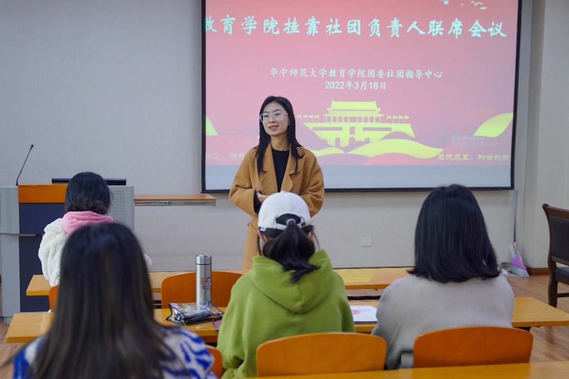 会议伊始,刘雅欣就教院挂靠社团在本学期开展工作的要求进行了详细布置。她提出,各部门负责人要仔细阅读教育学院社团中心管理条例,开展社团工作时注意遵循既定流程,规范地进行活动审批、经费报备等常规性工作。同时,刘雅欣针对各社团的发展提出建议。在疫情防控的形势下,刘雅欣希望各社团以安全为前提,广泛开展各类丰富多彩、健康向上的活动,丰富学生的校园生活,活跃教院的社团文化。她表示,教育学院挂靠社团众多,希望各社团都能在完成评价指标的基础上,实现社团的持续发展,力求建设出高质量的团体。
