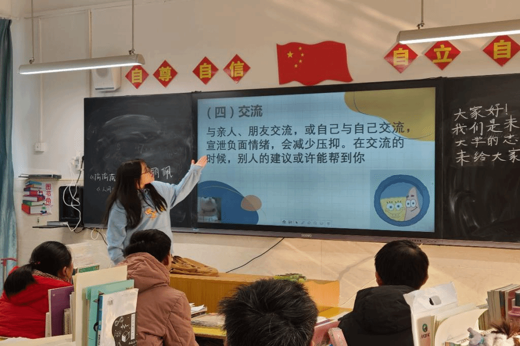 12月8日,志愿者赴聋校首次开展活动。班会课上,志愿者郭丽佩作为主讲人做“情绪的认知与调节”为题的班会展示 。她运用自身的掌握的手语知识,在聋校高一1班班主任姬振红的协助下,为在同学分享了认识、调节情绪的方法手段,帮助班内学生增强情绪的调节控制能力。