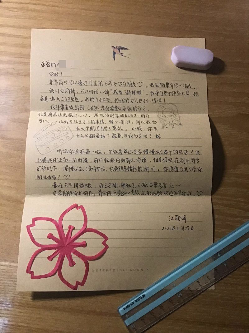 11月3日,经过项目组与姬振红老师的沟通,“信笺传情”活动正式开展。项目组通过意向调查、素质审核的形式招募一批固定志愿者,并告知写信的建议要求。为进一步建立服务双方信任,激发聋校学生表达自我的意愿,志愿者们积极承担责任,率先寄信交流,运用自身绘画、剪纸等兴趣优势增加信件的亲切感。在书信来往中,聋校学生与志愿者形成良好互动,聋校学生从开始时的羞于表达慢慢转变为乐于表达,信件内容也随之丰富起来。双方在信中交流生活学习感想,志愿者为聋校学生答疑解惑,排忧解难。