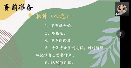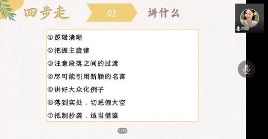 随后,刘璇结合自身参赛见闻与体验,介绍了“百生讲坛”比赛的得分重点。她运用框架导图阐述了“四步走”理念的具体要求和注意事项,从而加深与会同学对于“讲什么、怎么讲、怎么演、如何制作PPT与配乐”四个具体步骤的认识与理解。