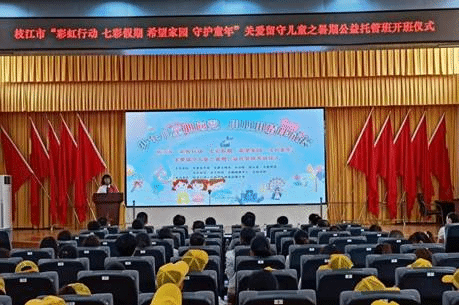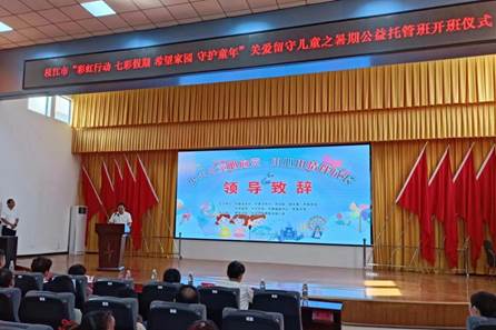 教育学院融媒体中心讯(通讯员 赵承 雷欣怡)7月16日,湖北省宜昌市枝江市“彩虹行动•七彩假期•希望家园•守护童年”关爱留守流动儿童之暑期公益托管班开班仪式在顾家店镇举行。湖北省妇女干部学校副校长张家燕,宜昌市妇联党组成员、副主席程智,枝江市委常委、市委统战部部长董广华等领导出席,各大学志愿服务队全体成员,市委宣传部、市委文明办、市教育局、市妇联等各部门相关负责人,顾家店镇“守护童年”项目结对帮扶爱心妈妈及全体留守儿童参加。