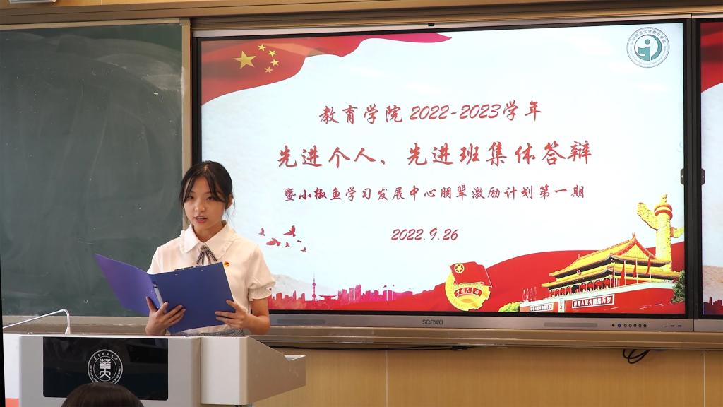 教育学院融媒体中心讯(记者 刘怡然等)9月26日,教育学院2022-2023学年先进个人和先进班集体答辩暨小椒鱼学习发展中心第一期朋辈激励计划在八号教学楼8314室举行。教育学院全体本科生辅导员担任评委,各班团代表担任大众评审,2022级本科生代表到场观摩,团委组织部负责人古晓燕主持活动。
