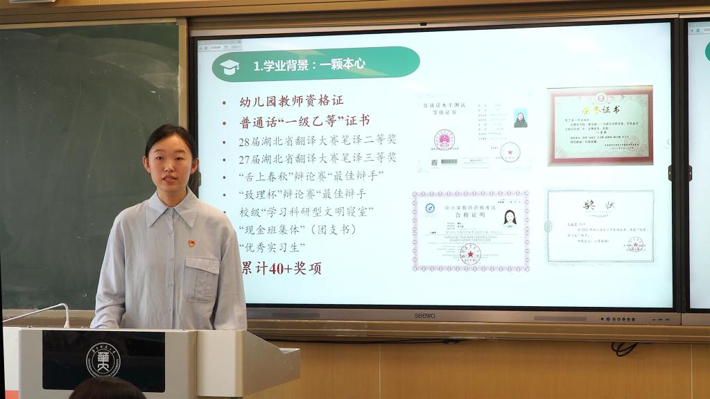 本次活动共分先进个人答辩与先进班集体答辩两个环节。在先进个人答辩环节,7名候选人分别结合自身学术科研、学生工作、社会实践等方面展开答辩,展现教育学院优秀学子昂扬的精神风貌。