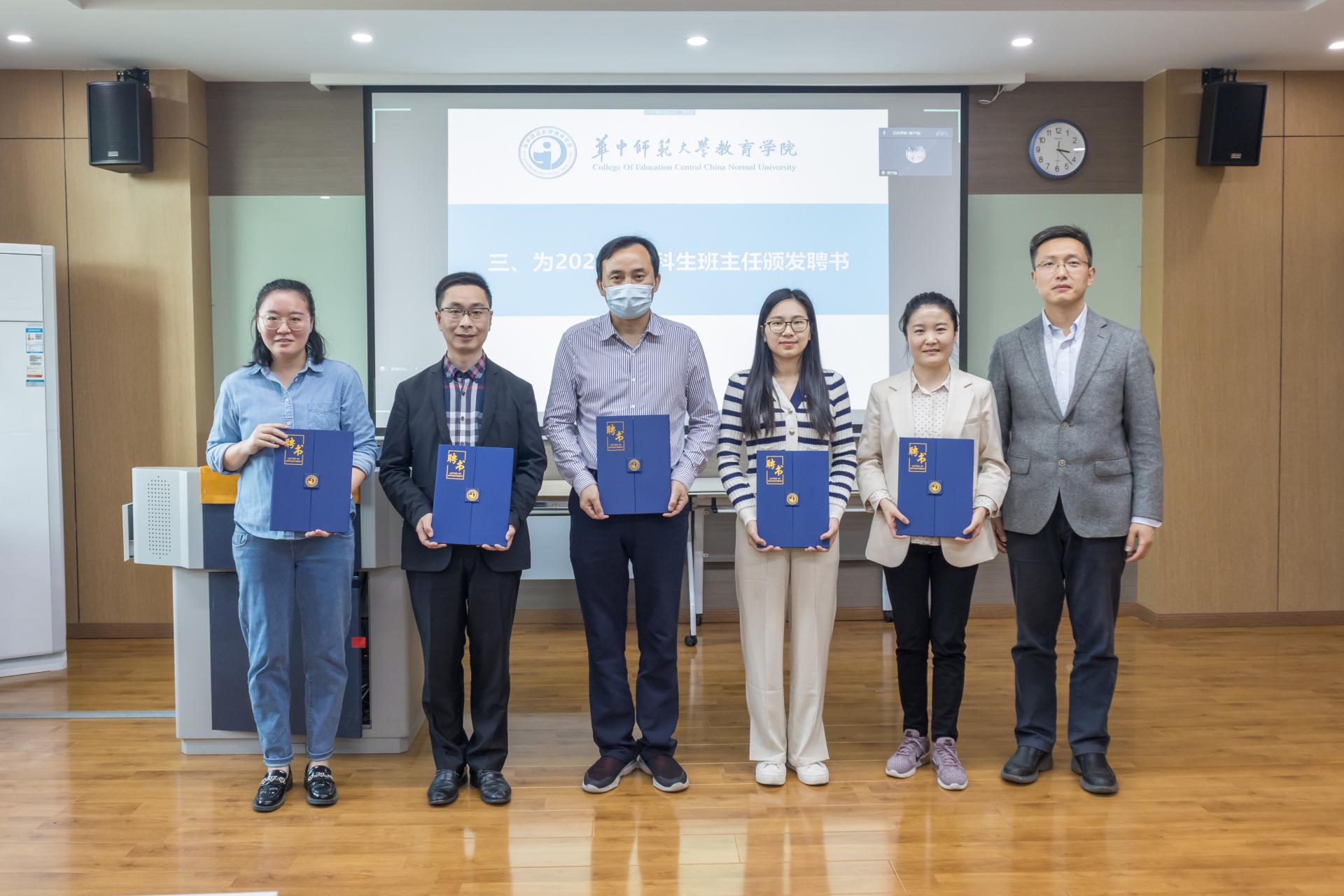 苏春艳宣读《关于聘任华中师范大学教育学院2022年度本科生班主任、外聘班主任的决定》,李刁、苏春艳先后为2022级本科生班主任代表、2022年度外聘班主任代表颁发聘书。