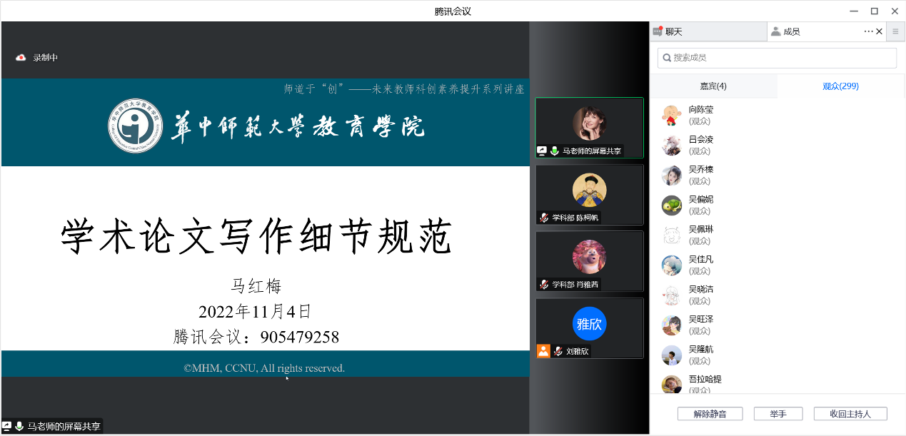 教育学院融媒体中心讯(通讯员 陈柯帆 刘佩欣 陈茜屿)11月4日,教育学院“育教于新——学术论文写作规范”主题讲座以线上的方式举行。华中师范大学教育经济与管理研究所副教授马红梅担任活动嘉宾,2021级本科生辅导员刘雅欣主持活动,教育学院约300名同学参加活动。