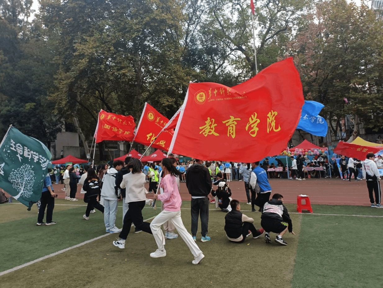 绿茵场上氛围热烈。在喧闹火热的音乐与欢笑声中,参赛者在志愿者的陪同下进行热身活动,为即将到来的挑战做好充足准备。教育学院的同学们围拢在赛道旁,向即将启程的运动员们送出自己的鼓励与祝福。教院的红色旗帜飘扬不息,象征着学院不懈进取的精神力量。