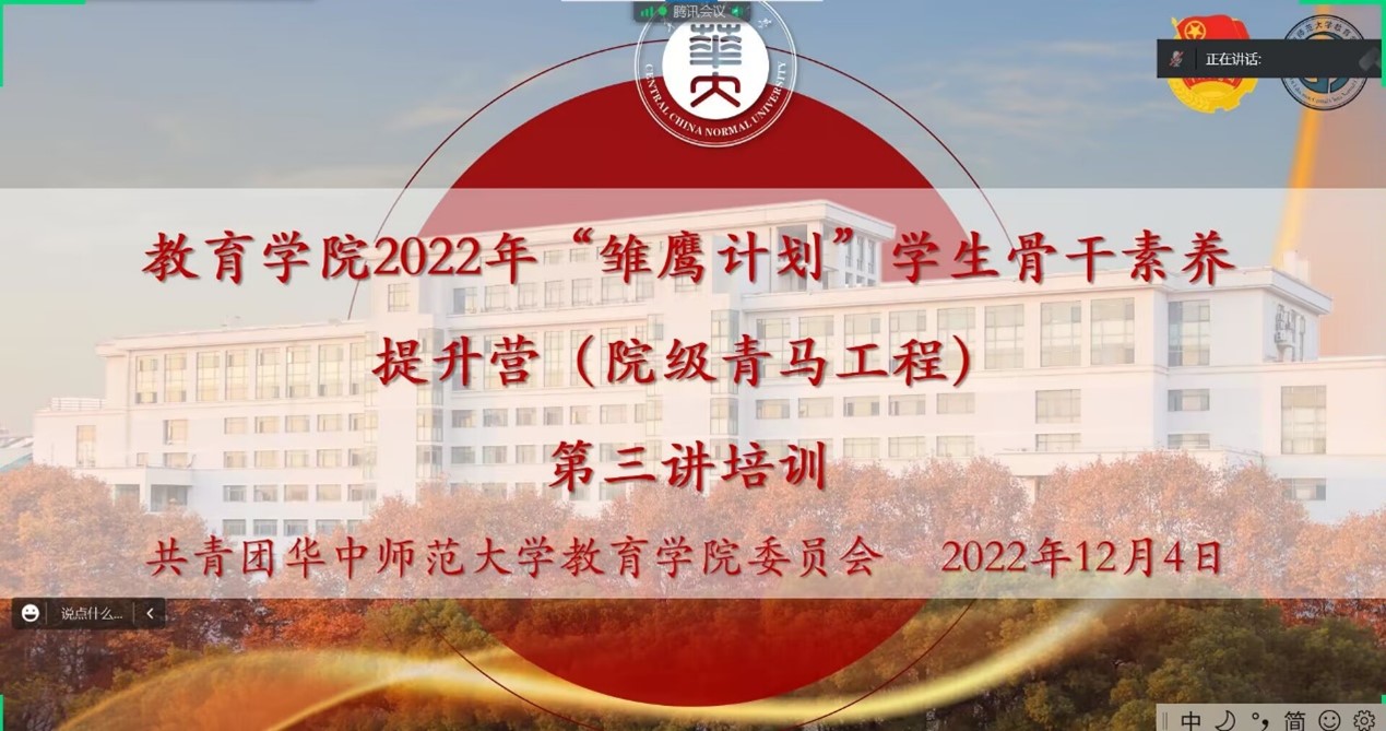 教育学院融媒体中心讯(通讯员 贺云妍 李宗宇)12月4日下午,教育学院“雏鹰计划”(院级青马工程)学生骨干素养提升营第三讲培训以线上形式举行。培训活动由校团委副书记、恽代英青年讲师团指导老师谢慧昭主讲,教育学院全体提升营营员参与培训活动。教育学院团委学生会组织部负责人胡鹤颜担任主持人。