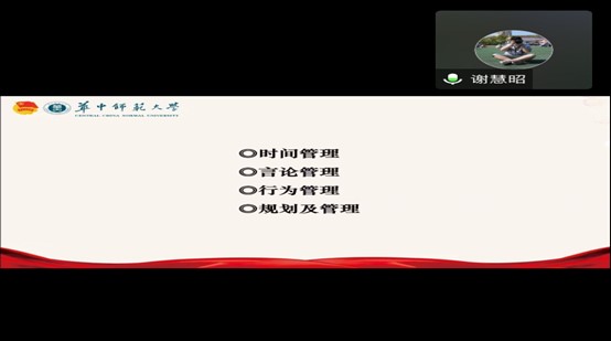 之后,谢慧昭阐述了当前团干队伍中存在的一些“乱象”,如思想动摇、意志薄弱、精致的利己主义、忙于工作而忽略学习主业、“两张皮”、学生官等。通过说明这些现象及其发生的原因与影响,他更为具象化地让同学们理解了良好的自我管理对于个人和团学工作的重要性。谢慧昭重点讲述了如何进行自我管理。自我管理包括时间管理、言论管理、行为管理、规划及管理四部分。他强调,同学们身为青年团干,应当有对于自己目前身份的认同,在行为前多加思考,考虑到自己作为的后果;应当做到慎独,增强自控力,同时也应做好本职工作。