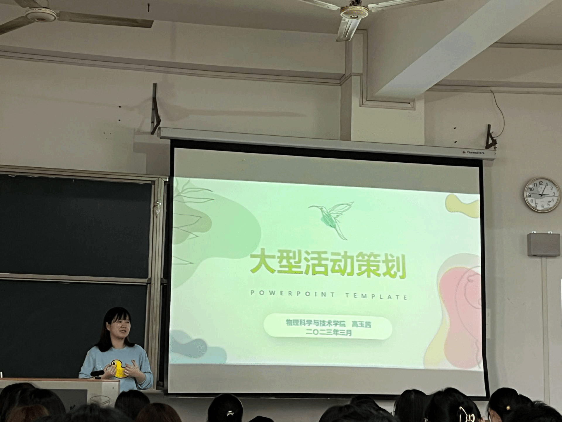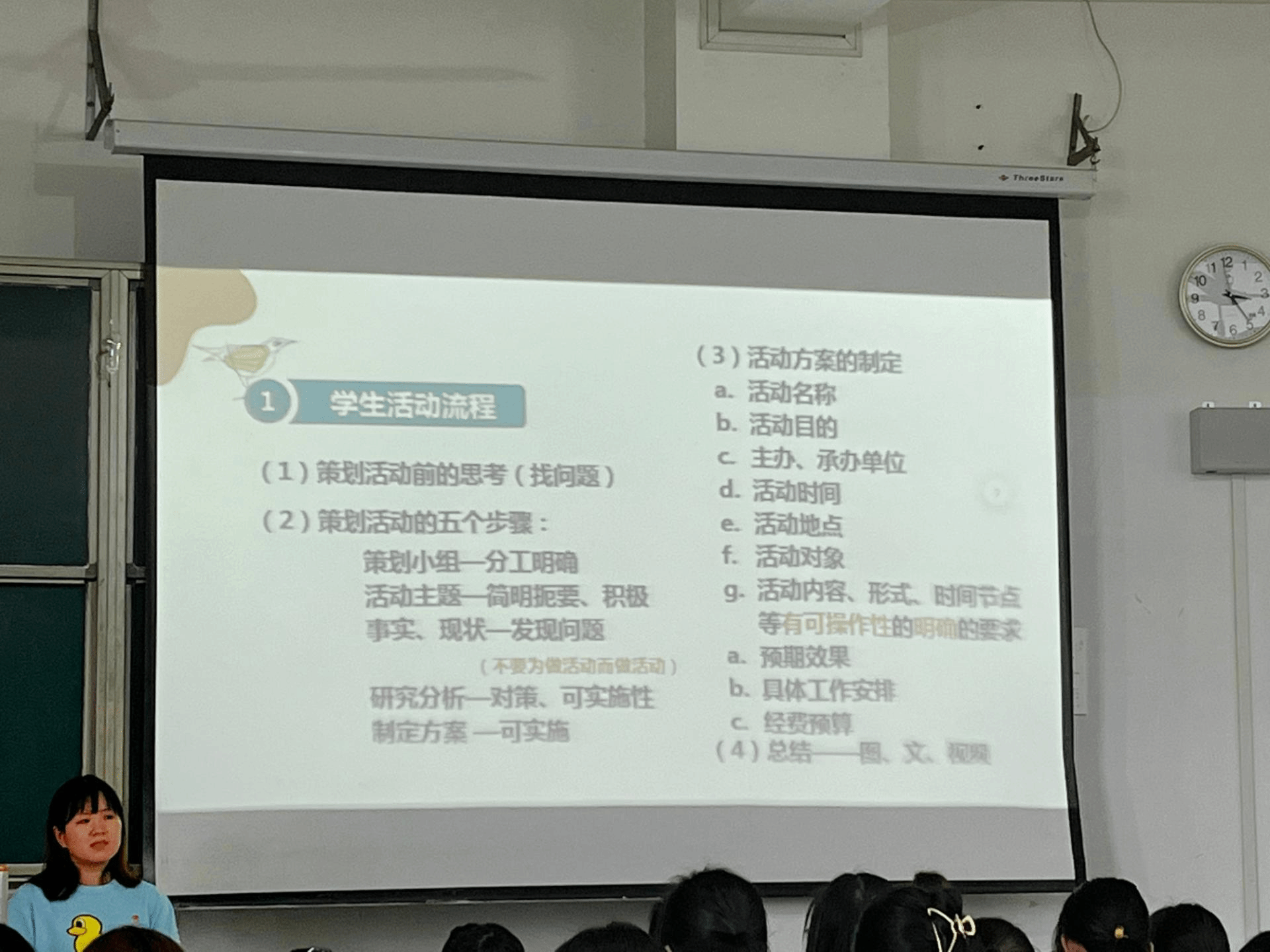 高玉茜以自己本科时期参与活动的经历作为切入点,引入第四讲“大型活动组织与策划”的培训主题。她提到,兴趣爱好是她积极投身于学生活动的重要推动力,鼓励营员们对待学生活动要抱有敢于尝试,敢于付出的态度,这样才能有所收获。