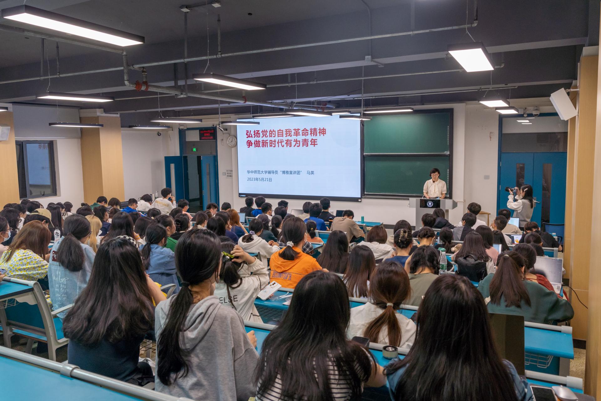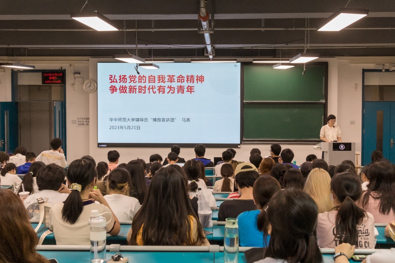 教育学院融媒体中心讯(通讯员 陈笑欧 王利娜)为继承和发扬党的自我革命精神,激励号召青年大学生奋进求学、矢志报国,2023年5月21日,华中师范大学辅导员“博雅宣讲团”成员、物理科学与技术学院党委副书记马英以《弘扬党的自我革命精神 争做新时代有为青年》为题作主题教育宣讲,教育学院辅导员张萌、王利娜及全体2022级本科生参与此次活动。