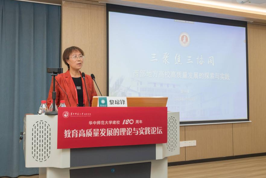 黎琼锋以贺州学院为例,作题为《西部地方高校高质量发展的探索与实践》报告。她结合当地高等教育“先天不足,后劲不够”等问题,着重介绍该学院“三聚焦·三协同”发展模式:一是聚焦人才培养合力,产教融合协同育人,坚持开放合作,教学过程中大力推行“一课双师”,走产业学院、行政学院“两院一体”的人才培养道路;二是聚焦内生发展动力,校地融合协同创新,积极融入当地经济社会发展,实现学科专业链与当地产业链的衔接贯通,努力打造“校城共生”的发展形态;三是聚焦创新创业能力,专创融合协调发展,以“课程双创”推动课堂教学改革,构建“四位一体”的创新创业教育体系。
