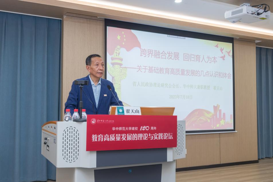 翟天山以《跨界融合发展 回归育人根本——关于基础教育高质量发展的几点思考》为题作报告,从教育、科技、人才“跨界”的角度提出了基础教育高质量发展的见解。他指出,我国基础教育当前走在世界领先水平,但由于受社会人才观念、收入分配导向、教育教学模式等影响,仍存在城乡教育、普职教育、学生身心发展之间不平衡、不充分的问题。他认为,基础教育高质量发展,首先要“跳出教育看教育”,与科技创新、生产劳动相结合,跨界融合发展其次要回应人的全面发展的要求,要与人民对美好生活的需要相适应,回归育人根本。为此,基础教育要加快统筹城乡协同发展,加快改革办学模式,加强教材建设与教育资源开发利用,建立分类指导的学校教育评价体系,提高教师素质。