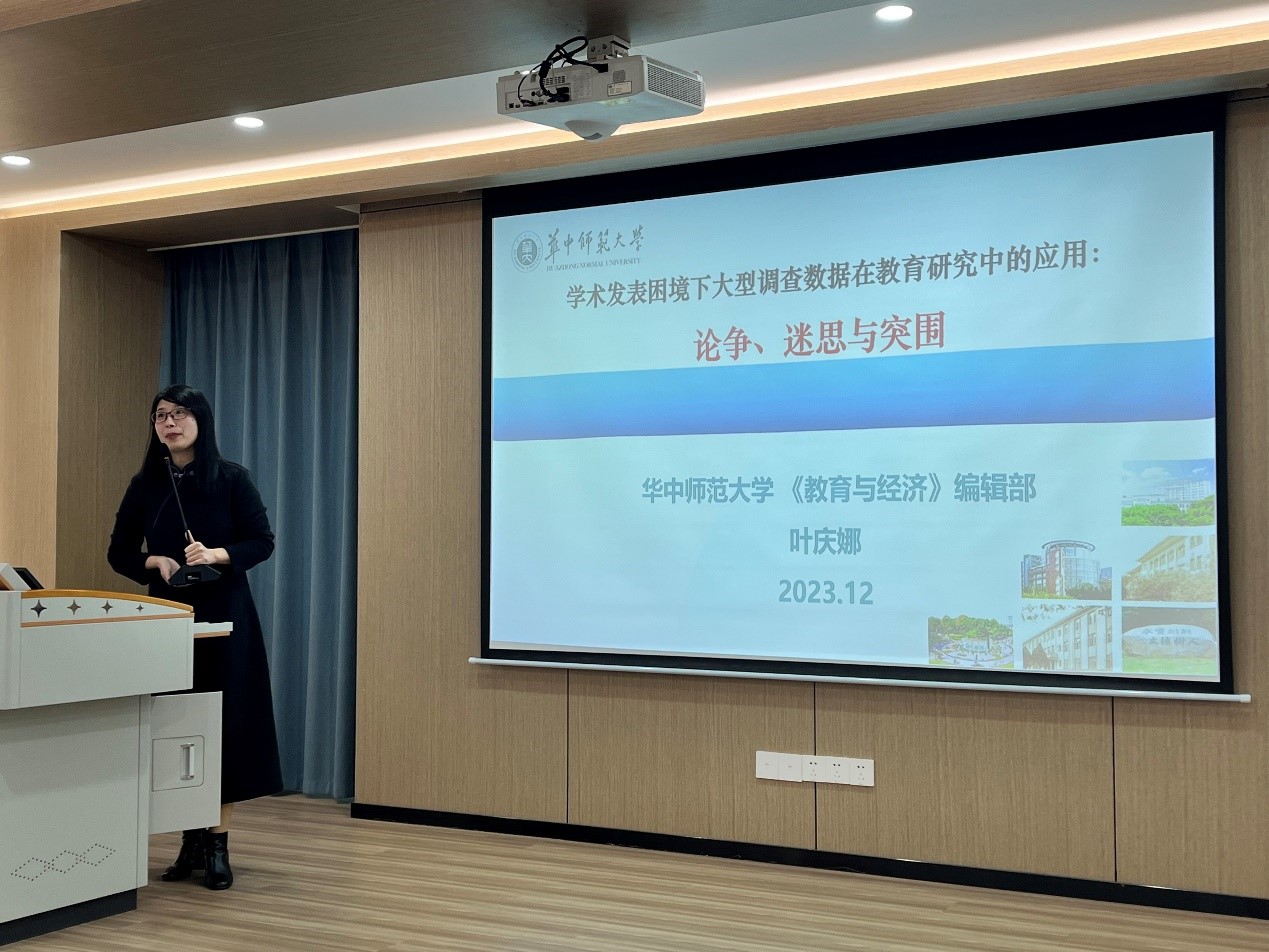 教育学院融媒体中心讯(通讯员 李冰 陈宇哲 黄奕扬 2023年12月1日,教育学院第52次学术午餐会在田家炳楼教育书院601报告厅举行。我院《教育与经济》编辑部副主编叶庆娜老师作题为《学术发表困境下大型调查数据在教育研究中的应用:论争、迷思与突围》的学术报告,会议由谭颖芳老师主持。