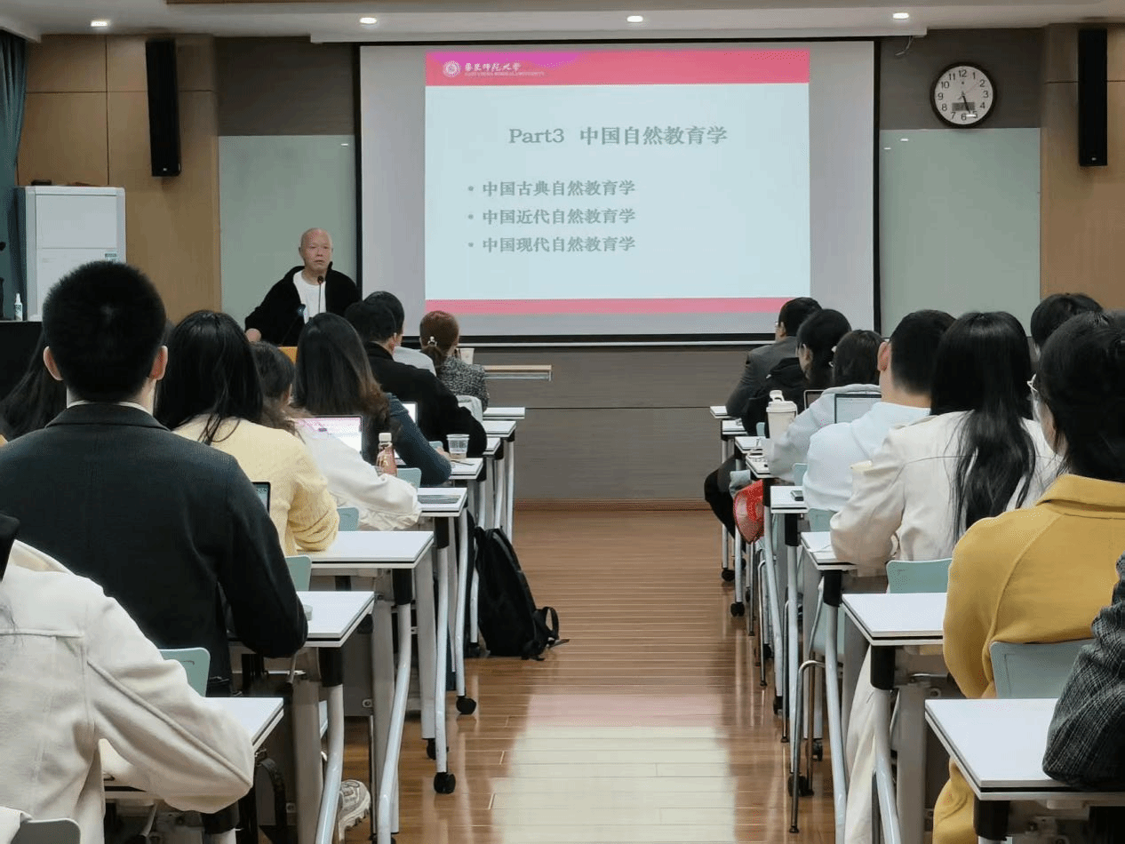 刘良华教授从“人与自然的关系”“西方自然教育学”与“中国自然教育学”三个方面展开系统阐述。在“人与自然的关系”部分,刘教授提出“自然生产与自然教育”“离开自然与返回自然”“人的主体性与小自然”三个层次,强调教育应回归到“小自然”——即自然进程、自然本能、自然权力。他特别指出当代儿童面临的“自然缺失症”问题,并借助《林间最后的小孩》这一著作的名字,呼吁教育应引导孩子“融入自然、欣赏自然、研究自然”,成为“自然之子”。在论及“西方自然教育学”时,刘良华教授系统梳理了从古典时期的犬儒学派、伊壁鸠鲁学派,到近代夸美纽斯、卢梭,再到现代杜威等教育家的自然思想脉络,指出西方自然教育学从“回归自然”走向“经验与自然”的演进逻辑。在“中国自然教育学”部分,他旁征博引,从儒道佛三家自然观的教育意蕴,延伸至湖湘学派、洋务运动、维新变法中的相关思想,揭示中国自然教育学的文化根基与当代价值。
