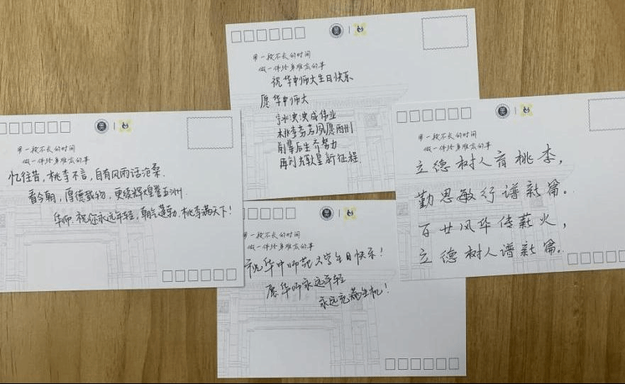 第三部分,为迎接国庆与校庆双庆,硕研第一党支部组织支部成员用华教学堂的明信片写下自己的祝福与期冀。忆往昔,桃李不言,自有风雨话沧桑;看今朝,厚德载物,更续辉煌眷五洲活动;华师,祝您永远年轻,朝气蓬勃,桃李满天下。