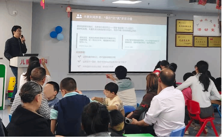 趣味游戏和手工DIY环节结束后,同学们与家长共同聆听了华中师范大学特殊教育系刘文元博士带来的《养育不是独行》主题分享。刘老师围绕孤独症儿童家庭的力量来源,深入阐述了家庭内部支持、夫妻共同养育以及外部社会支持的重要性,为在场家长提供了实用的心理调适建议与情感共鸣。