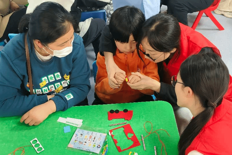 活动伊始,师生们在儿保科老师的带领下参观科室,并旁听团训课,深入了解在训儿童的日常康复训练。15时,活动在门诊北区8楼宣教室正式开始。现场设置了趣味游戏与手工DIY等环节。游戏环节,同学们分工协作,帮助布置游戏现场,维持游戏秩序,鼓励孩子们参与“鸭子蹲”“抢杯子”等互动;在手工DIY环节,同学们则陪伴在孩子身边,耐心辅助他们完成手工作品,现场氛围温馨融洽。