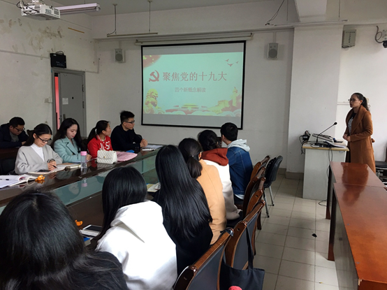 大会伊始,支部成员现场交纳党费、重温入党誓词、诵读党章。随后,党支部书记张迪以PPT的形式带领大家一起学习解读十九大报告中的四个新概念。她首先从整体上简要介绍了党的十九大会议主题及中国共产党人的初心和使命;其后围绕“新时代”、“新矛盾”、“新思想”、“新目标”四个关键词依次展开讲解。她讲到:经过长期努力,中国特色社会主义进入了新时代,我国社会主要矛盾已经转化为人民日益增长的美好生活需要和不平衡不充分的发展之间的矛盾,形成了习近平新时代中国特色社会主义思想,提出了在本世纪中叶建成富强民主文明和谐美丽的社会主义现代化强国的目标。最后总结我们在新的历史起点上,将要走向的是一个国家、民族复兴的时代,作为一名青年党员要勇于承担责任,为实现中华民族伟大复兴贡献自己的一份力量。