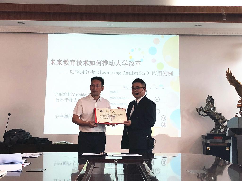 讲座伊始,首先由雷万鹏院长主持了客座教授聘书颁发仪式。雷院长为吉田教授颁发聘书,他表示希望吉田教授今后多来我院进行学术交流,为我院及其他院系学子带来国外新的教育信息技术研究热点,拓展学子的研究视野。吉田教授现任日本国立千叶大学教授,主要从事教育信息化、国际教育开发以及教师专业发展的国际化方面研究。他本人是日本学术振兴会的成员,是日本国家政府对外教育交流与合作的长期专家。主持和负责国家政府、世界银行、联合国教科文组织的教育项目多次,也是泰国国家教育部在ICT领域的重要顾问,曾担任泰国国家网络教育局局长。同时吉田教授也是ICT领域国际期刊的审稿人,境外高校博士论文审查委员。不论是在学术研究还是在国际项目领域,吉田教授都有着丰富的研究和实践经验,在我院全面推进教育国际化和信息化方面的助力可期。