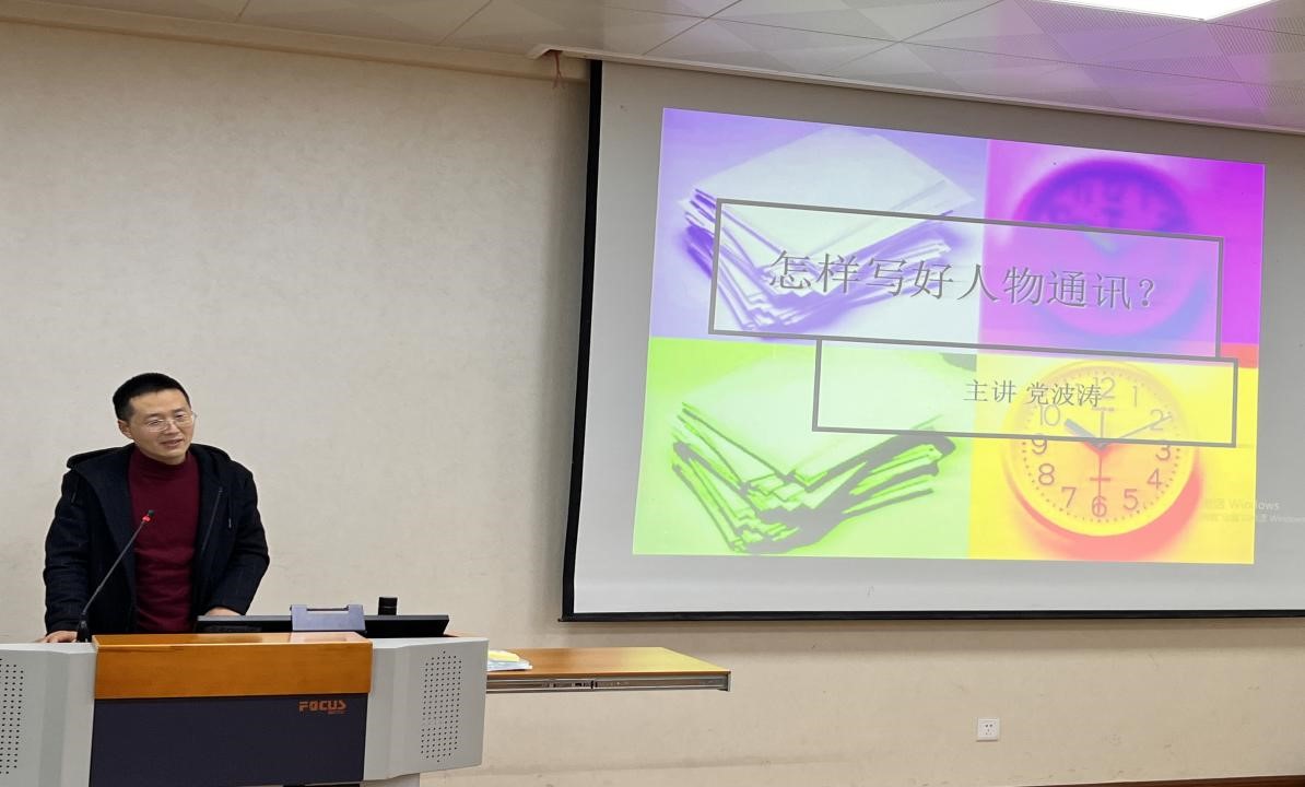 党波涛老师以《怎样写好人物通讯?》为题,为同学们介绍了人物通讯的概念,并对完成人物通讯的流程做了简要介绍。党波涛指出,人物通讯是用来报道有影响有特点的人和事,全面深入报道事物的来龙去脉;党波涛还提到,人物通讯要反映事物本质,做到细节描写丰富,以叙述为主,可以灵活运用描写及抒情、议论,并可使用多种修辞手法,注重语言表现力。
