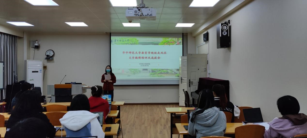 教育学院融媒体中心讯(通讯员 吴凯)教育学院校友风采文字编辑培训及选拔会于2022年3月19日下午在田家炳大楼502教室开展。培训由华中师范大学党委宣传部党波涛老师主讲,教育学院党委副书记黄玉新出席。参与本次校友风采文字编辑培训及选拔会的还有来自教育学院各年级本科生、研究生及教育学院党建中心的同学。本次活动旨在为百年院庆及双甲子校庆校友风采撰稿工作培养编辑人才。