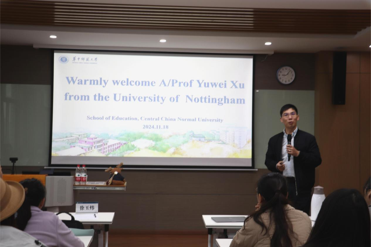 教育学院融媒体中心讯(通讯员 张宇)11月18日上午,英国诺丁汉大学教育学院徐玉炜副教授来我院访问交流,讲座在田家炳教育书院905报告厅顺利举行,50余名在校师生参加了此次活动,讲座由教育学院国际化发展中心主任徐添喜教授主持。
