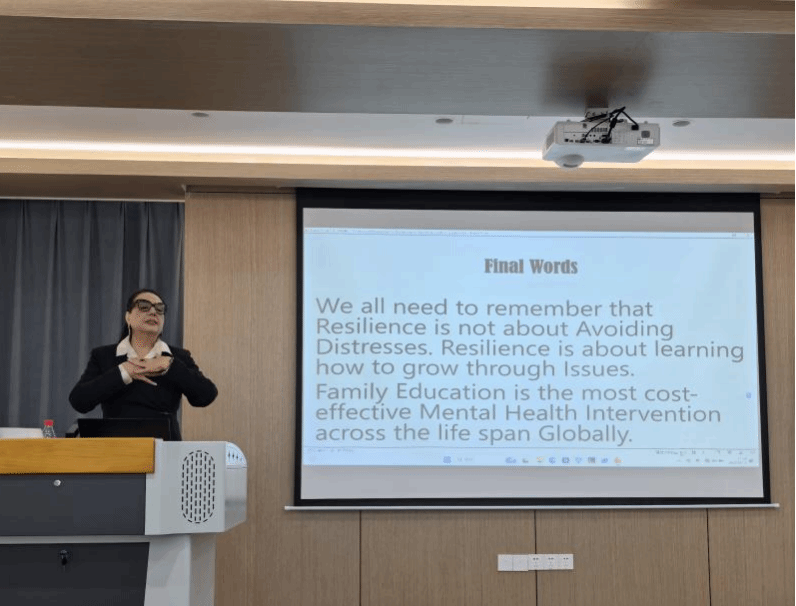 讲座伊始,Ehteshami教授以当前全球范围内普遍面临的心理健康挑战为切入点,结合当下儿童面临焦虑、习得困难、注意力缺陷多动症(ADHD)等问题的高发趋势,依托生态系统理论、社会学习理论、家庭系统理论三大经典理论框架,系统阐述心理韧性、心理健康和家庭教育三者之间的关系。她特别强调,家庭是预防、干预与促进儿童心理健康康复的重要场所。家庭教育可作为儿童心理韧性培养的重要工具,有助于提升儿童在压力管理、问题解决、社会交往等方面的能力。