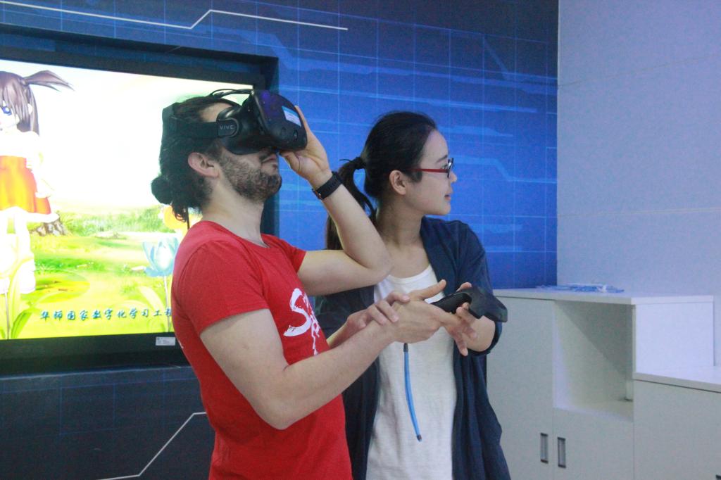 校史馆参观完毕后,交流团队在喷泉广场进行自由合影留念,接着被志愿者带往国家数字化学习工程技术中心。技术中心工作人员首先介绍了21世纪人才培养支撑体系,使学生们对数字化学习工程有了初步认识。其后,澳方学生走进智慧教室,亲身体验了一堂别开生面的智能课堂。课堂中,工作人员向学生展示了starc云平台上的资源、应用、服务与工具,带领学生完成智能师生交互,使学生完整地查看了云平台进行的数据收集、建模与分析。随后工作人员开启多屏教学,展示了触屏与电子白板在教学中的优越性——既能方便教师授课,更能够加深与课学生对知识的认知与理解。当黑白琴键出现在屏幕上并在工作人员手中奏出音乐时,交流团不少学生发出了惊叹。参观的最后,工作人员邀请一位澳方学生体验了VR眼镜,仪器内设置了武汉的风景名胜,使体验者在室内也能身临其境地欣赏武汉风光。受邀学生戴上眼镜后,在展厅内四处走动的同时操纵手杆,兴奋地向自己的同伴分享眼前所见,团队一时间妙趣横生、笑语连连。