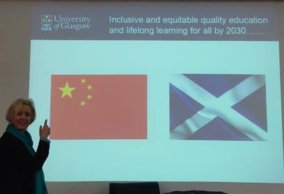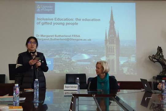 (通讯员 孙珂 编辑 吴佳妮)11月20日下午3点整,英国格拉斯哥大学教育学院Dr. Margaret Sutherland在田家炳624会议室开展了以《融合教育与天才儿童教育》为主题的学术讲座。我院特教系孙玉梅老师、袁维老师、国际化秘书杨文黛老师,以及英国格拉斯哥大学国际办公室尹老师、格拉斯哥大学教育学院学生指导员Sabine Moha参加了此次讲座。在场师生热情高涨,会议室座无虚席。