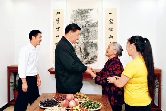 2019年9月16日至18日,中共中央总书记、国家主席、中央军委主席习近平在河南考察。这是16日下午,习近平在信阳市新县田铺乡田铺大塆“老家寒舍”民宿店,同店主一家亲切交谈。 新华社记者 谢环驰/摄